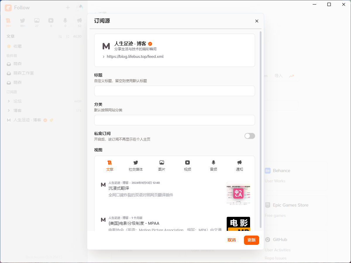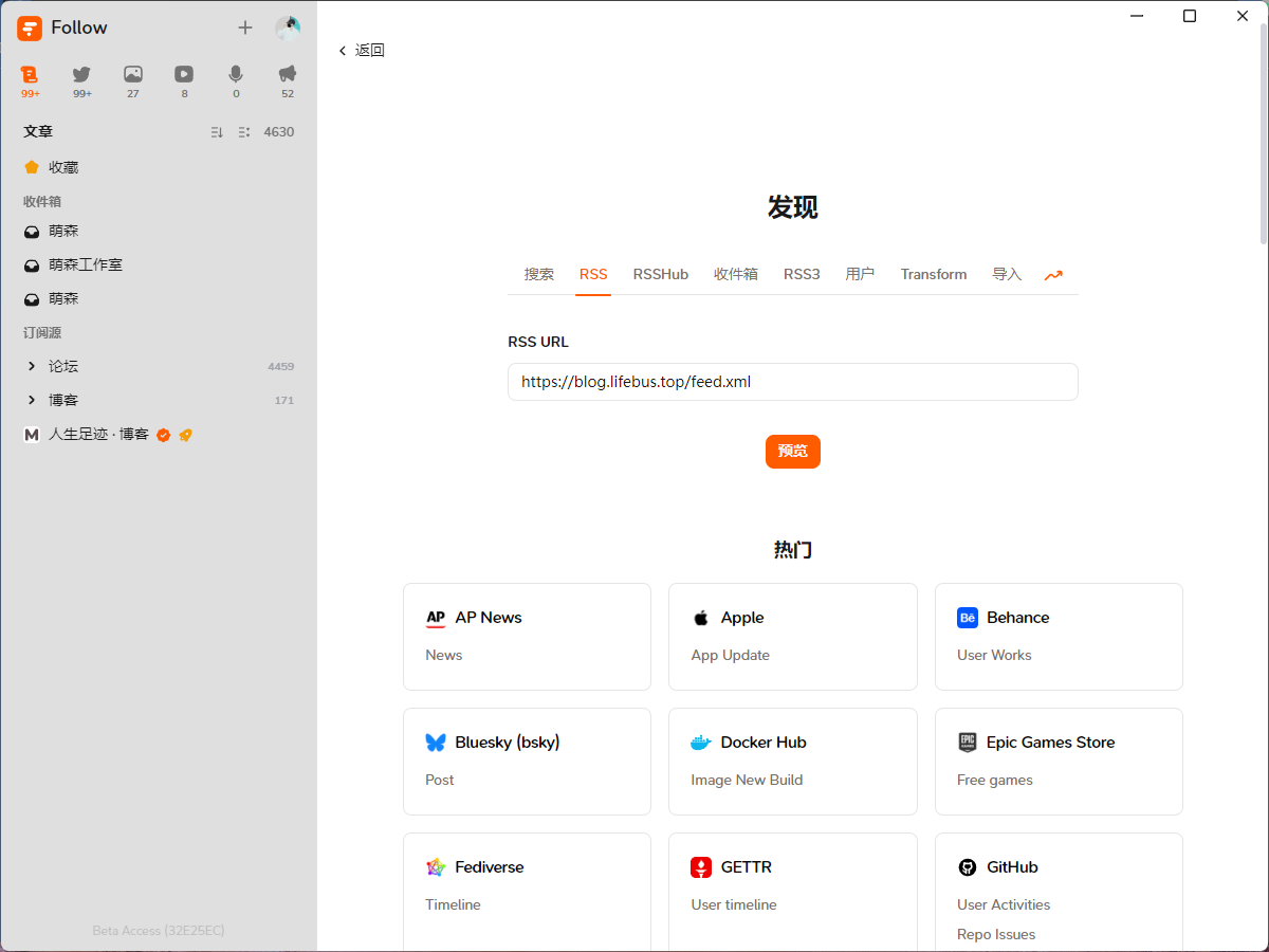 将地址:https://blog.lifebus.top/feed.xml 粘贴到Follow中